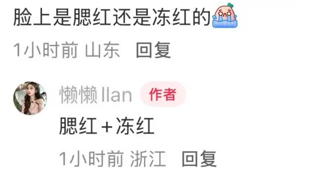 她的脸看着通红,粉丝有点心疼的问,是被冻的还是腮红?想要拍美照,懒懒必然是化过妆了,那么红扑扑的脸蛋就是腮红+冻红,懒懒很直白、有一说一从不藏着掖着。