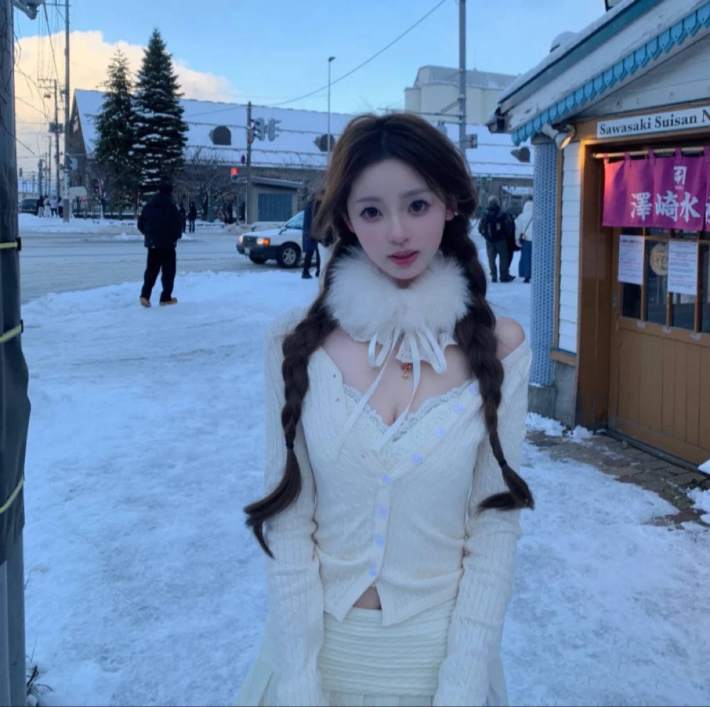 这大V领的上衣,配了蕾丝内搭、白色毛领,露肤的面积不是很多,却足够性感撩人。不愧是卖衣服的,懒懒是真懂男人心超会穿。