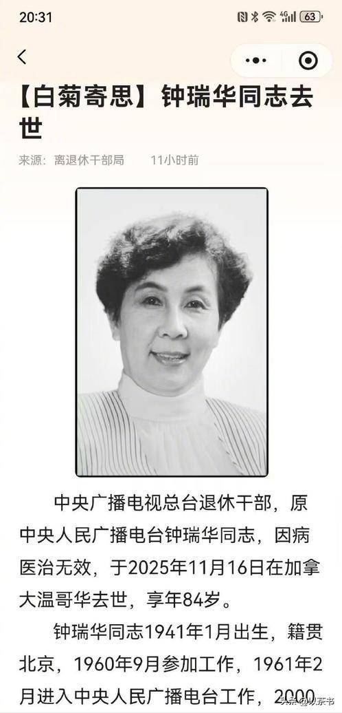 11月16日,钟瑞老师在加拿大温哥华因病离世,享年84岁。这消息,是央视广播电台的退休人员账号发出来的。