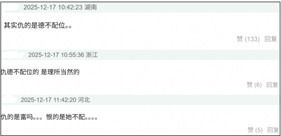 舆论发酵后,粉丝试图将大众对鞠婧祎高收入的批判定义为“仇富”,但是这想法实在是狭隘,大家对鞠婧祎高收入一事愤愤不平,本质是因为大众觉得以她的实力不配有这么高的收入,网友从来仇的都不是富,而是德不配位。