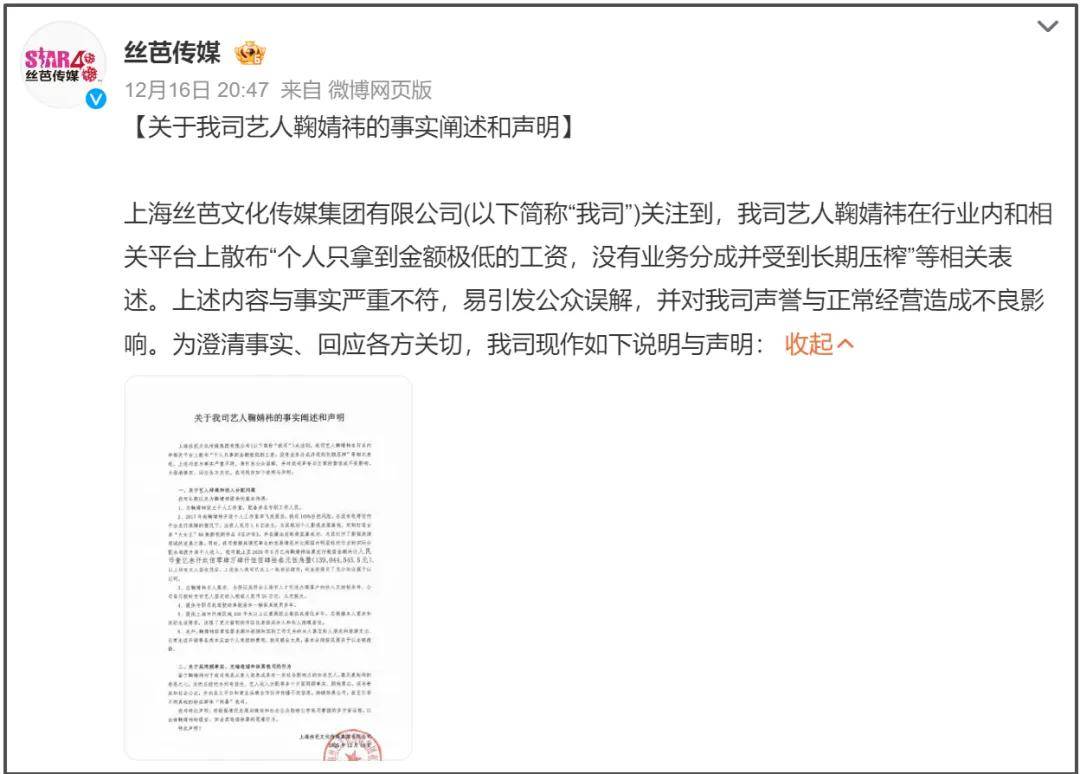 鞠婧祎和前公司丝芭传媒之间的纠葛真的是剪不断、理还乱,本来大家觉得是公司压榨艺人,直到丝芭传媒发布了一则关于艺人鞠婧祎的事实阐述和声明,直接实现口碑反转,鞠婧祎反而被