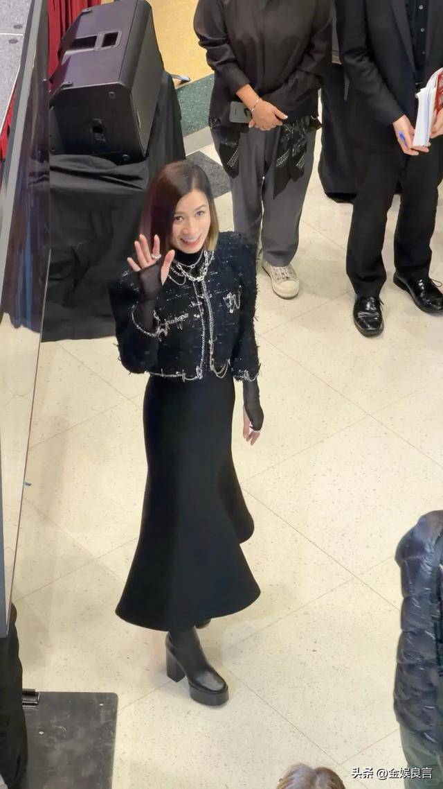 当晚她穿了一套简约的黑色西装套裙,利落的短发梳在耳后,整体造型干练又不失女人味。