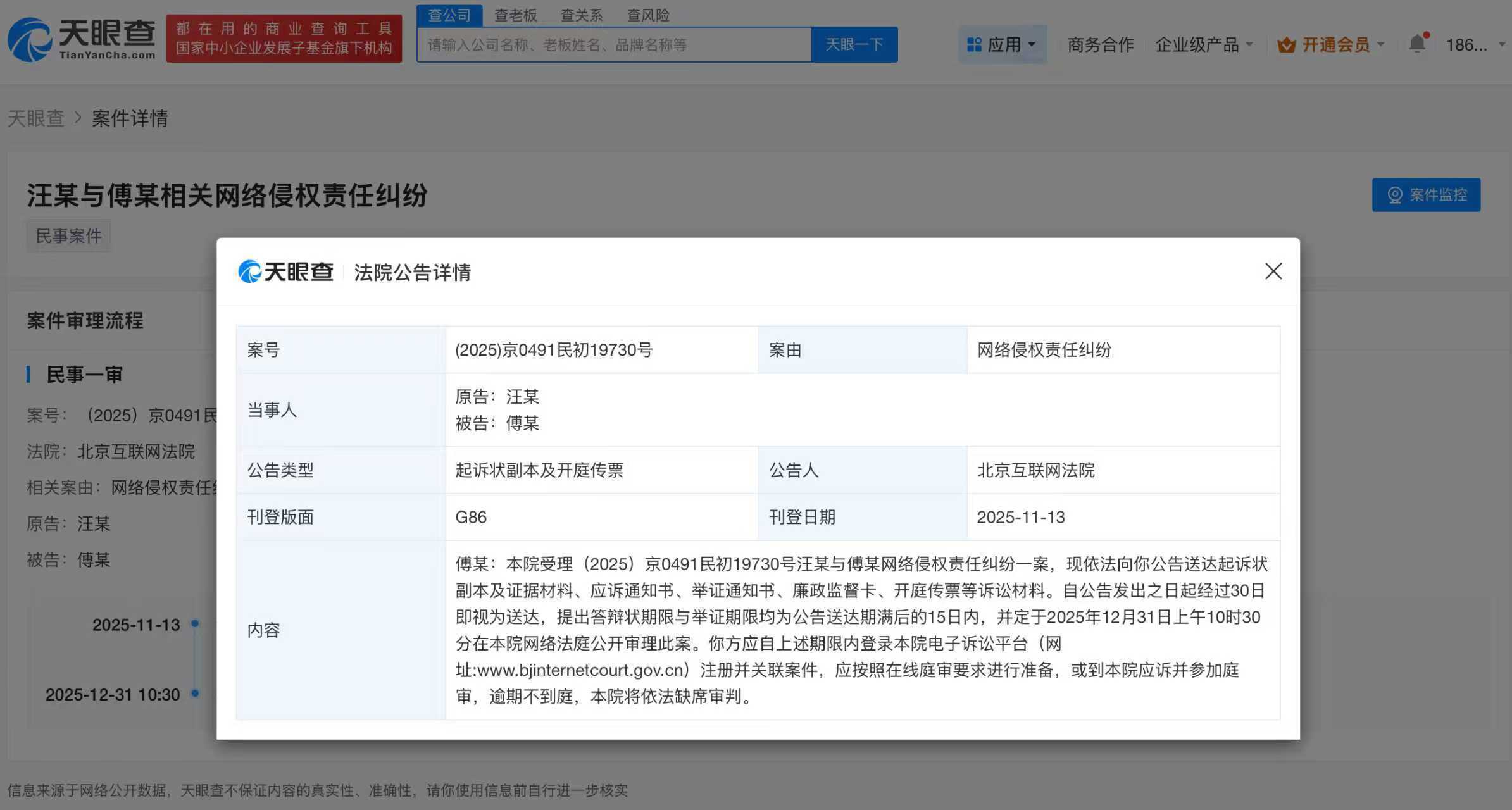 天眼查App显示,此前,北京互联网法院向傅某公告送达汪苏泷与其网络侵权责任纠纷案起诉状副本及证据材料、开庭传票等,并定于2025年12月31日开庭审理。