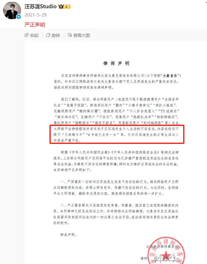 值得一提的是,汪苏泷工作室曾在2021年就已经否认了汪苏泷“已结婚5年”、“6年前已生有一女”等言论。