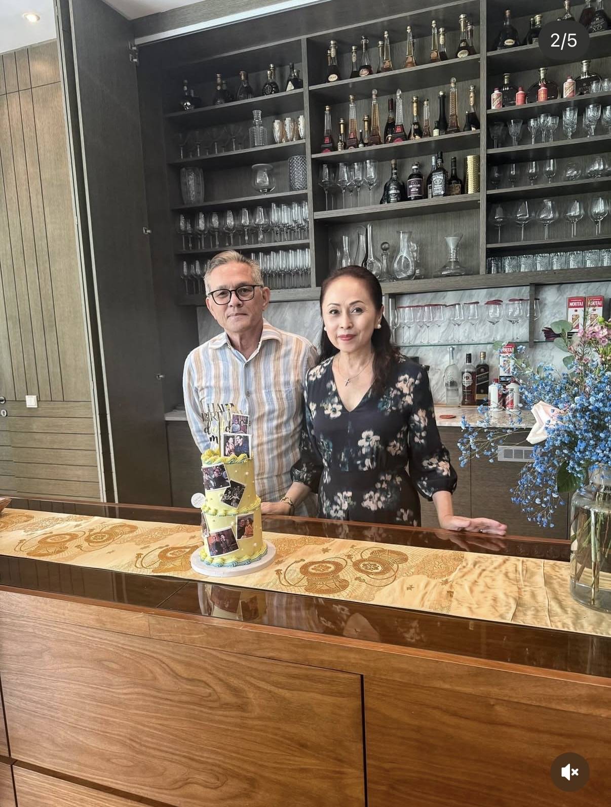 石贞善的父母,坦白说还真是看不出实际年纪。石贞善的父亲穿了竖纹衬衣,戴了一副黑框眼镜,沉稳而有型,他的头发已经花白,但是发型一丝不苟,看得出年轻的时候很帅气。母亲穿了黑色碎花长裙,妆容精致,打扮大方、得体,年轻的时候也一定是一个大美人。石贞善的父母站在吧台后合照,两人跟前是一个双层的黄色生日蛋糕,上面有两人的各种合照,夫妻俩没有很亲昵的举动,不过看起来就是默契十足,恩爱不需要刻意去秀出。