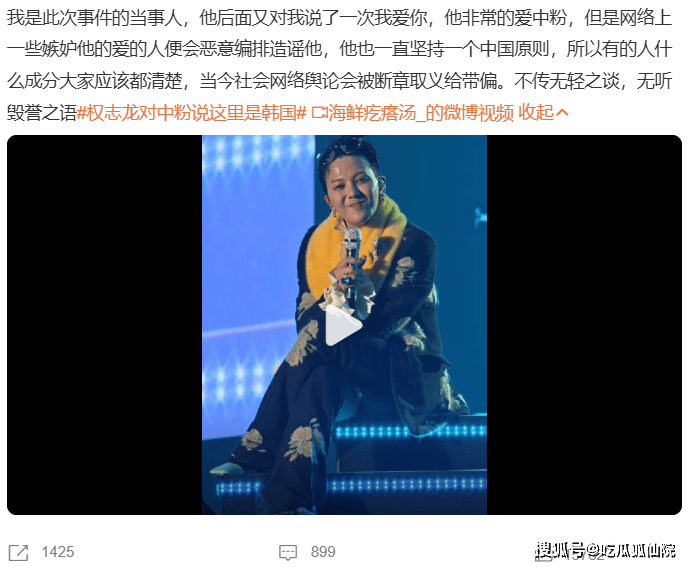 权志龙坚持一个中国原则,并用实际行动予以证明。近期,权志龙因在首尔演唱会与粉丝互动时的一句话引发争议,部分台媒、韩媒及营销号仅截取 “这里是韩国” 片段,解读