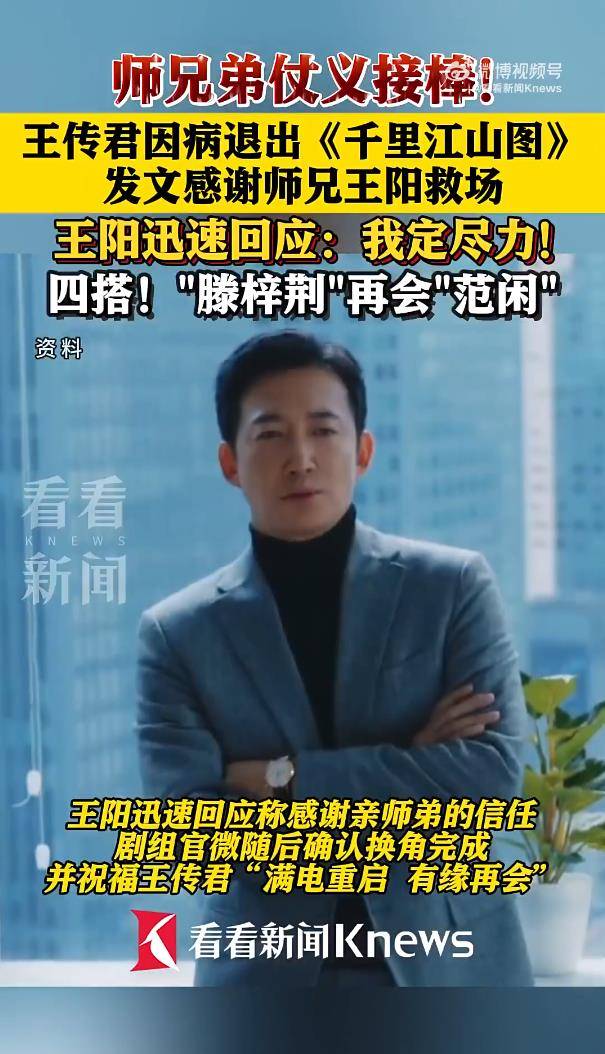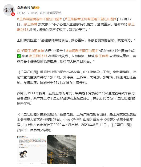 事件脉络清晰得像按了快进键:上午十点整,王传君发文透露因身体原因需退出拍摄,并点名感谢师兄王阳救场;仅仅9分钟后,王阳便转发回应“承蒙老朋友的召唤,我定尽力”;又过了几分钟,剧组官微正式盖章确认换角完成,并送上对王传君的祝福——“满电重启,有缘再会”。此时,距离《千里江山图》11月27日开机,不过约二十天。