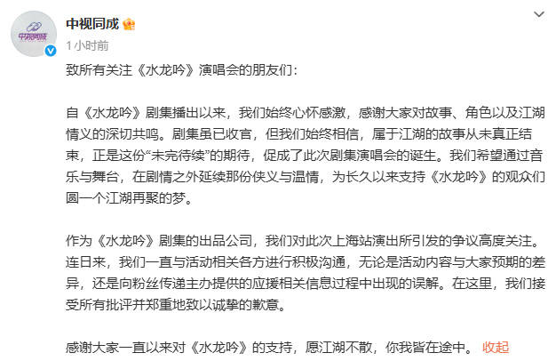 12月17日,《水龙吟》演唱会主办方发文道歉,称一直与活动相关各方进行积极沟通,“无论是活动内容与大家预期的差异,还是向粉丝传递主办提供的应援相关信息过程中出现的误解。在这里,我们接受所有批评并郑重地致以诚挚的歉意。”