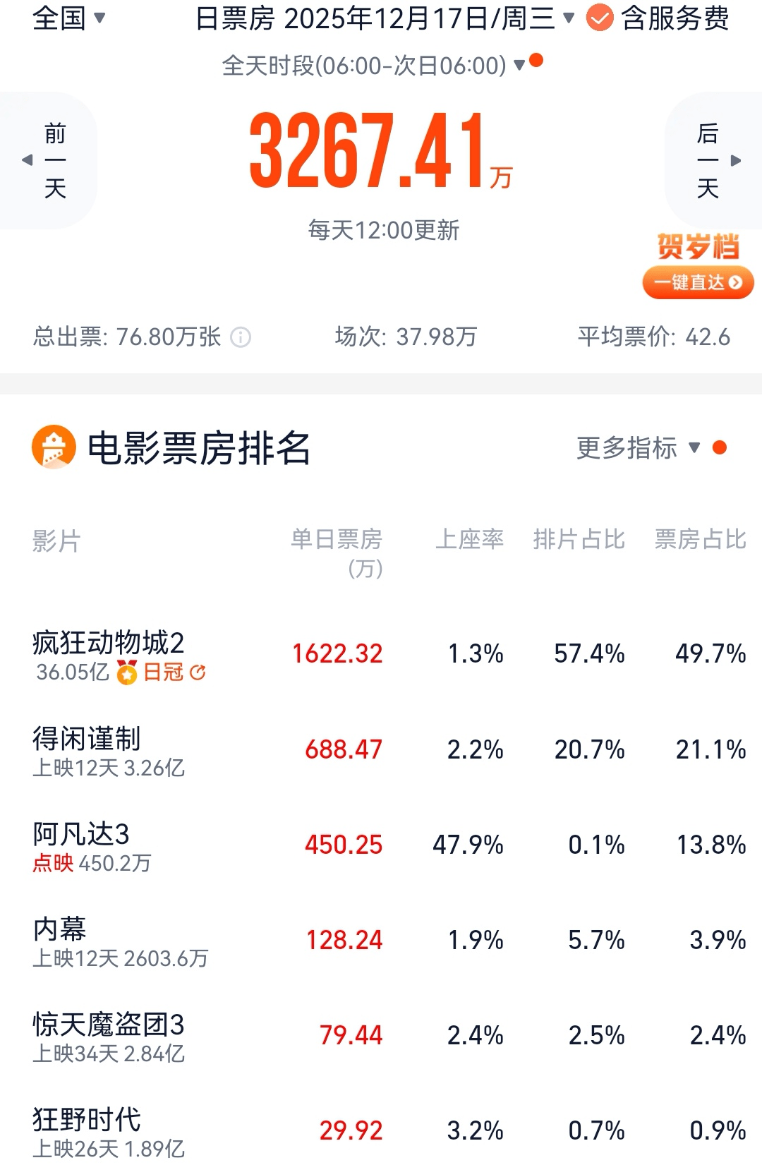 另一部好莱坞进口续作《阿凡达3》于12月17日晚在全国Cinity影厅限定点映,晚场放映近450场,场均人次超过142.4,上座率47.9%,以450万元的成绩挤进单日票房前三名。