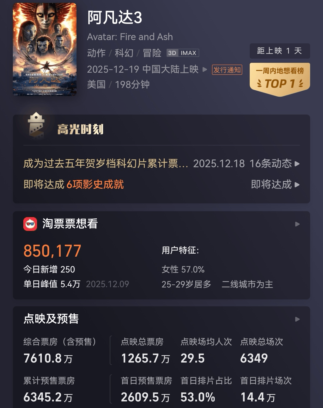 12月18日,《阿凡达3》继续点映,当日预售票房已过800万元。