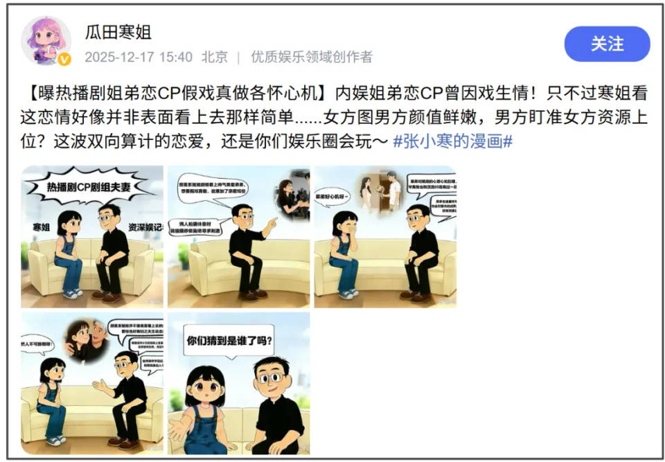 狗仔又爆料啦!指向性不要太明确,先来吃一波瓜吧。根据资深娱记老Z的说法,最近有一部热播剧姐弟恋CP假戏真做了,只是双方各怀心机。姐姐看上去是清纯小白花,实际上经常因戏生情,年