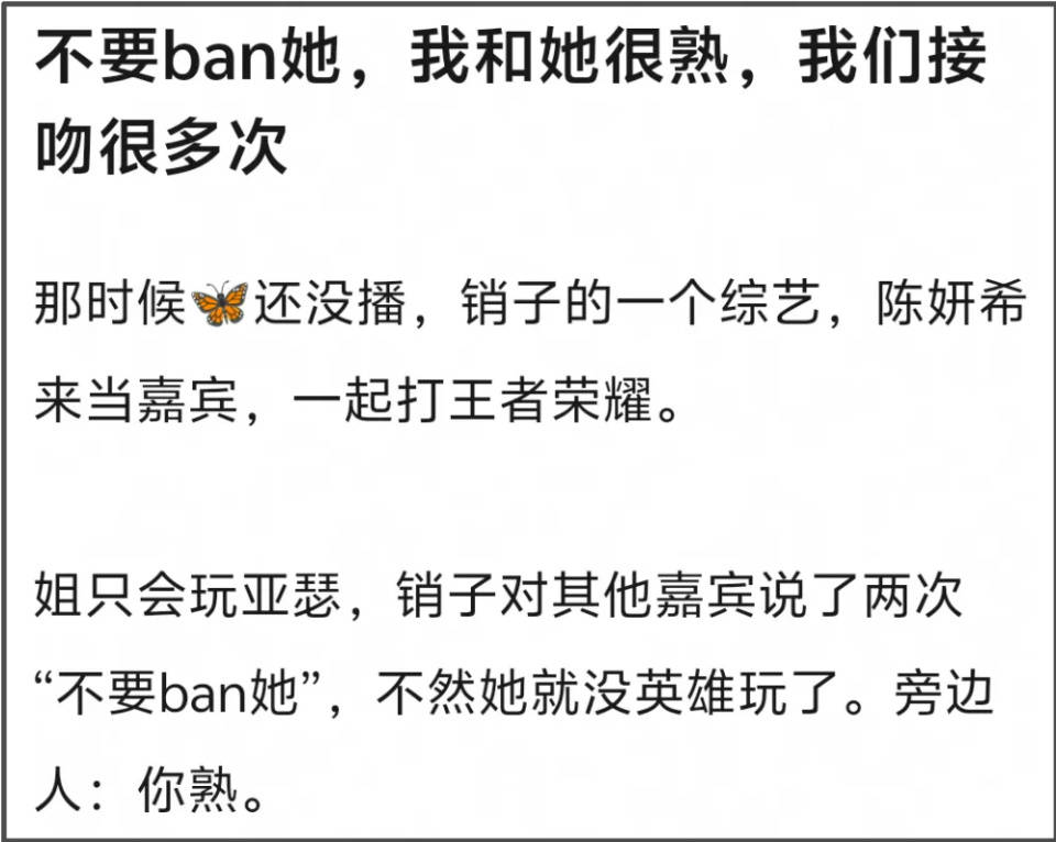 陈妍希之前是不玩游戏的,拍了《狙击蝴蝶》才开始玩,周柯宇对陈妍希的游戏水平了如指掌,不仅知道她擅长玩哪一个英雄,还知道她只会玩那一个英雄。