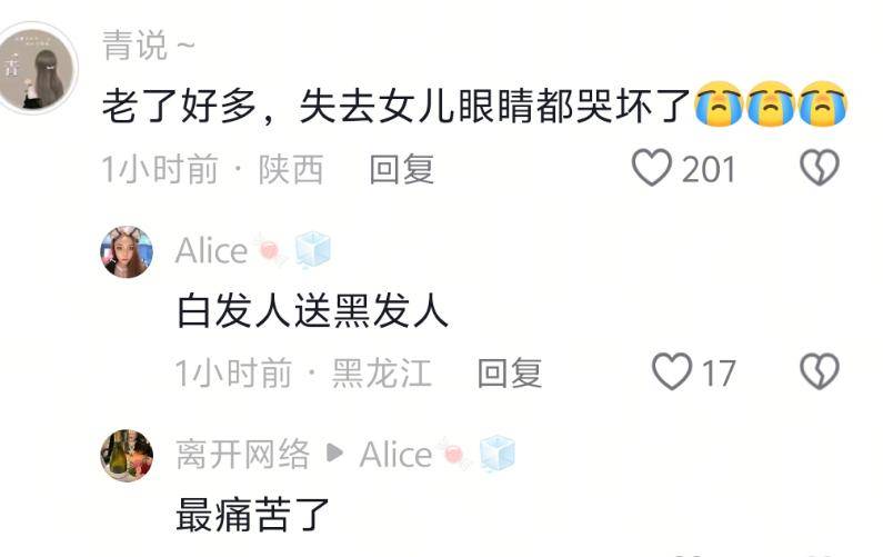 她现在的眼睛都无法睁开,眼眶红肿,对比她自己年轻时美丽的样子已经完全认不出,有种被思念所折磨的苦,网友看到她都是满满的心酸。