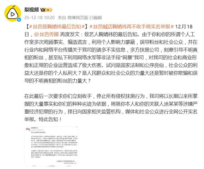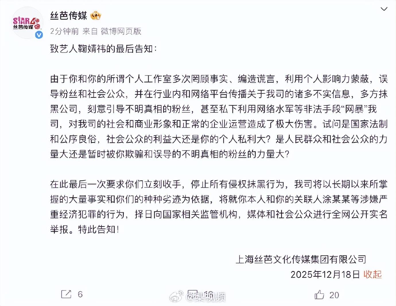 一纸“最后通牒”,让本就扑朔迷离的明星合约纠纷,瞬间炸出了刑事指控的火药味。12月18日,上海丝芭文化传媒集团有限公司通过官方微博,向旗下艺人鞠婧祎及其工作室发出《最后告知》,措辞之严厉、指控之升级,堪称内娱“手撕”名场面。