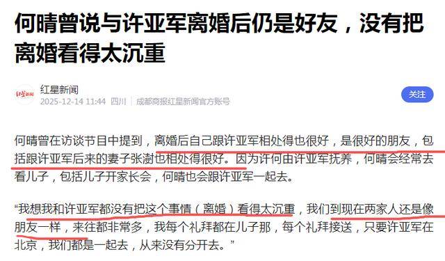 不过离婚后,两人的相处倒不像普通前任那样生疏。何晴曾说,他们一直密切配合抚养许何,甚至她和许亚军的现任妻子张澍也相处得很好。