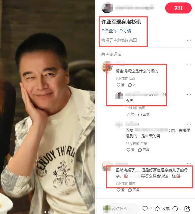 后来有网友爆料,何晴葬礼当天,许亚军人在美国,正在陪小儿子吃饭。这个消息一出,更让大家好奇,他为什么不回来陪难过的大儿子许何?