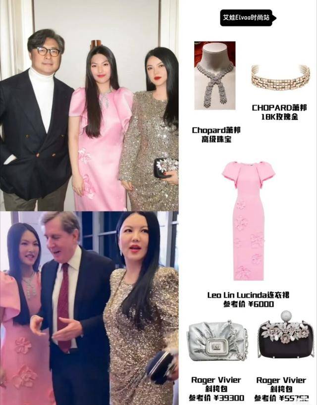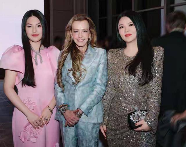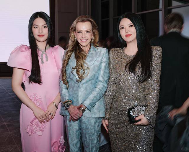 母女俩一出场,就让人想到“珠光宝气”这个词。在满场朴实无华的西装海洋里,她们的造型格外引人注目。