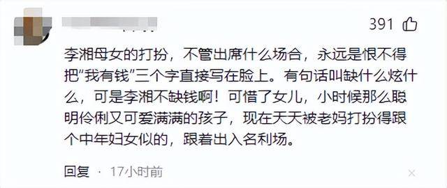 但在什么场合就穿什么衣服,是大家默认的共识。李湘母女的华服和现场氛围太格格不入,给人一种不分场合,只为显摆的感觉。