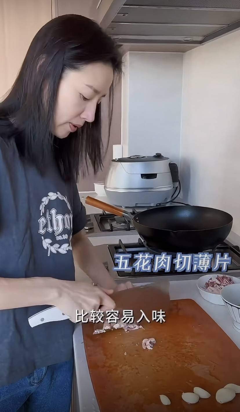 董洁正在认真的备菜,先把蒜剥好、然后拍一下。五花肉切成拨片,这种下饭菜自然少不了五花肉,煸炒一下五花肉特别香。切成薄片也很容易入味,董洁平日里没少做饭,经验真不少。