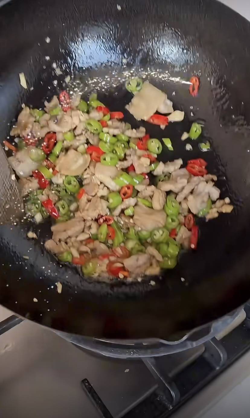 煸五花肉的时候,有一个小细节。就是先把肥肉煸香,其实就是炒出油的意思,然后再把瘦肉放进去继续煸炒。肥肉和瘦肉都煸炒到变颜色之后,就可以把切好的小杭椒倒进去了。
