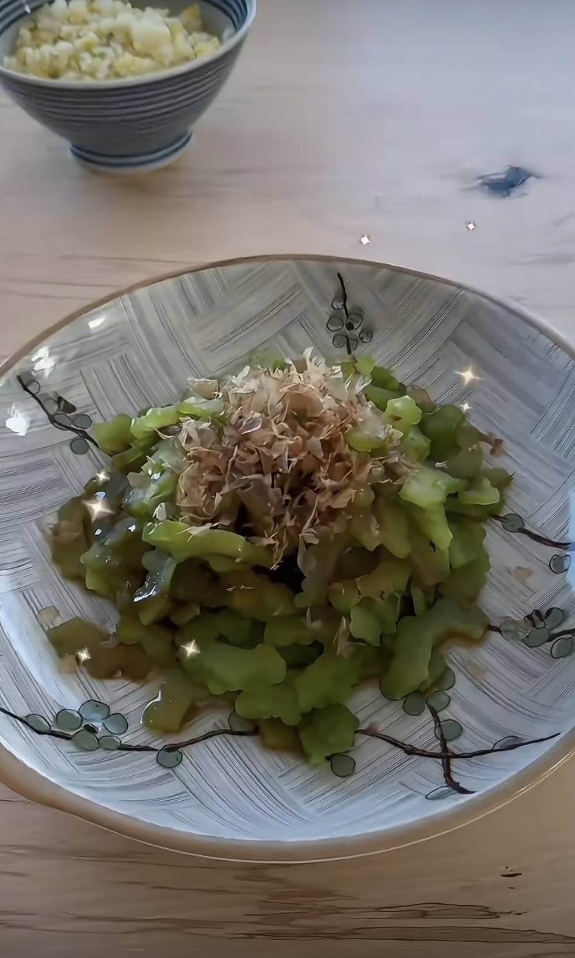 除了刚刚做的一碗香,还有一个白灼虾、一个清炒苦瓜。两碗蛋炒饭配3个菜,很难想象董洁一顿饭能吃这么多。