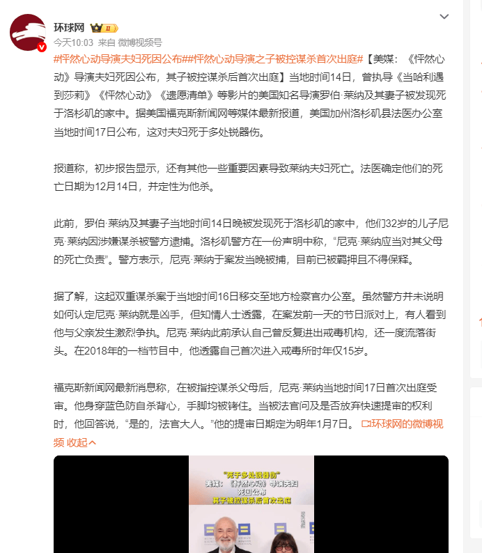 (来源:环球网)当地时间14日,曾执导《当哈利遇到莎莉》《怦然心动》《遗愿清单》等影片的美国知名导演罗伯·莱纳及其妻子被发现死于洛杉矶的家中。据美国福克斯新闻网等