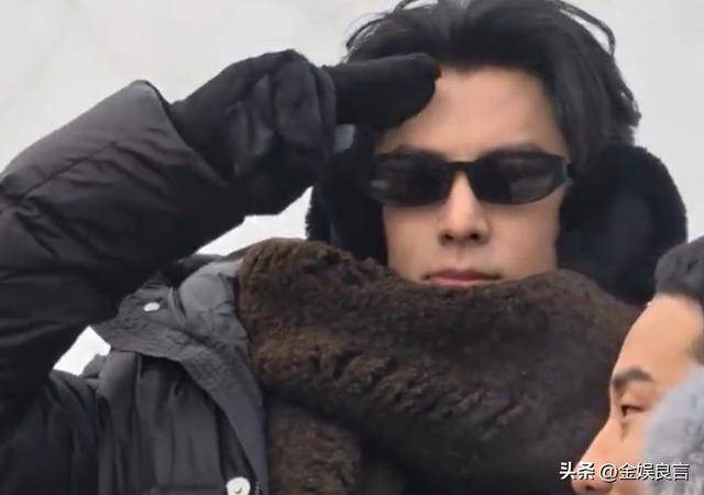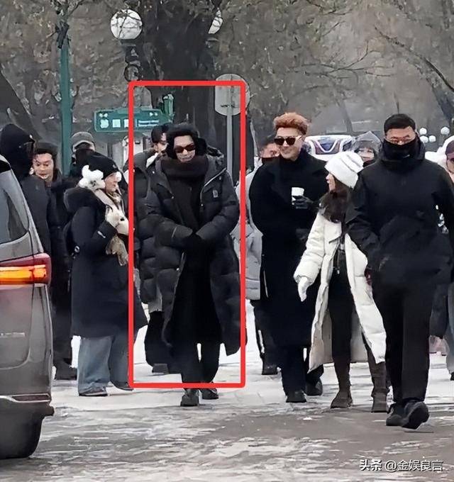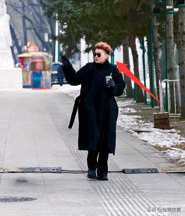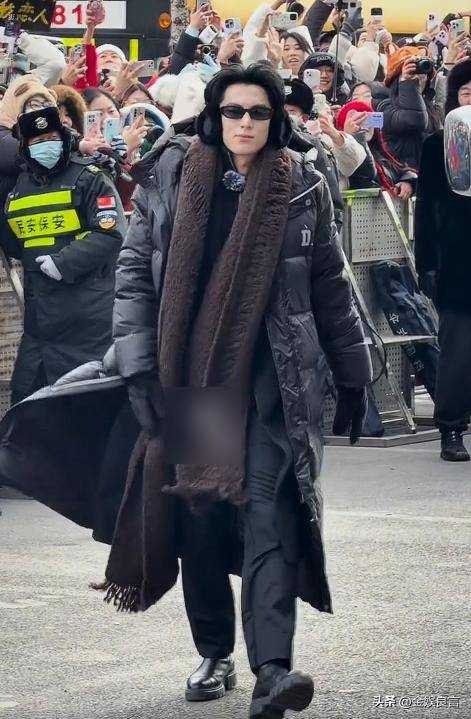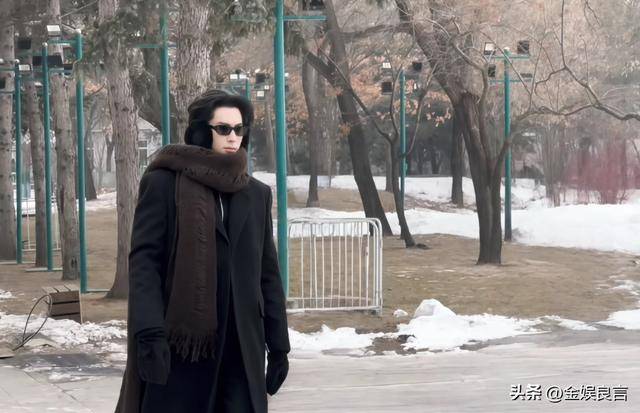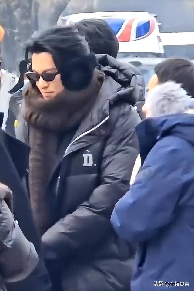 他穿黑色羽绒服搭棕色的围巾,黑色西装裤配皮鞋,头上还戴着耳罩,从侧面一看,简直像是裹成了求。