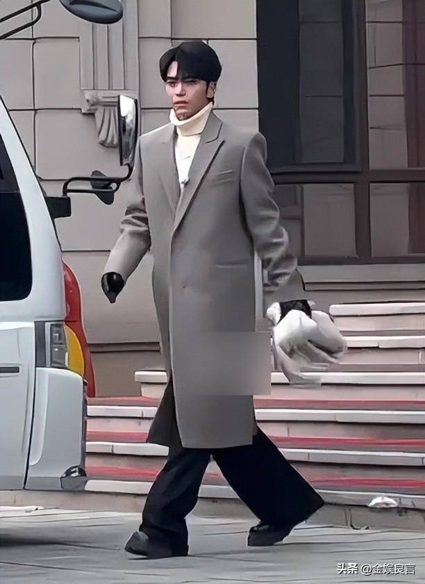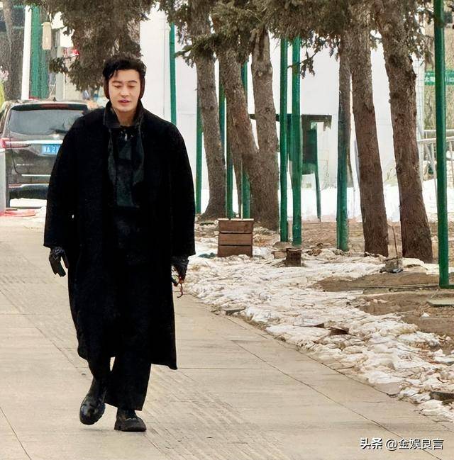 他穿黑色长款风衣,版型宽松却撑得起挺拔身形,内搭黑高领、下身深色休闲裤配马丁靴,全黑穿搭保暖又潮。