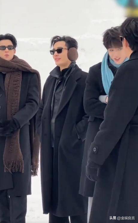 只有王鹤棣一个人穿着羽绒服把风衣裹在了里面。