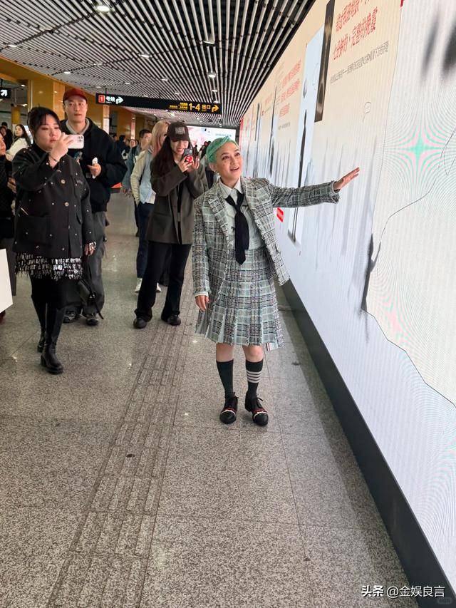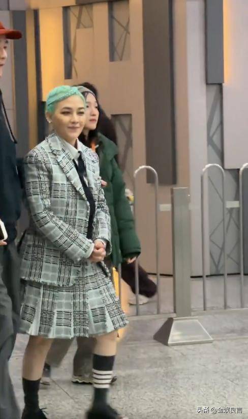 她留着短到不能再短的绿色寸头,发色亮得有些扎眼,发质看着干涩,远看像戴了顶不合身的假发,还有人调侃“以为是金龟子来了”。