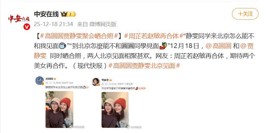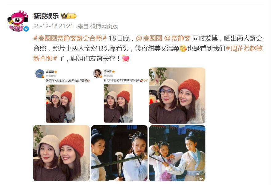 12月18日晚,高圆圆和贾静雯在微博上的一次“同步操作”,瞬间把无数网友拽回了22年前的江湖。两人同时晒出亲密头贴头的聚会合照,配文“到北京怎么能不和圆圆同学见面”和“静雯同学来北京怎么能不和我见面”,这宛如闺蜜日常打卡的互动,直接让#赵敏周芷若又同框了#冲上热搜,炸出了一波声势浩大的“回忆杀”。