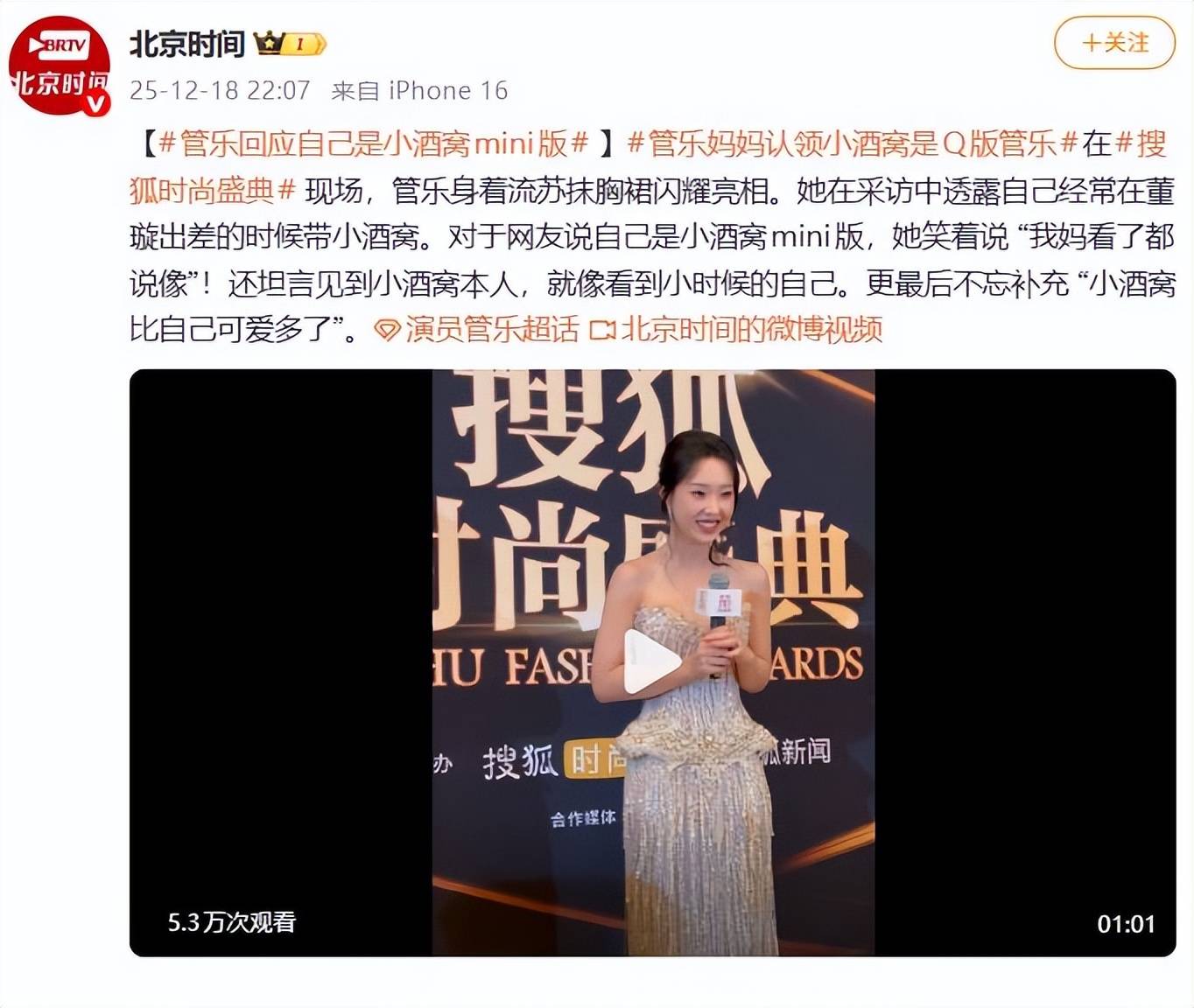 搜狐时尚盛典的红毯上,管乐一袭流苏抹胸裙光彩照人。而在后台采访中,一个温馨又充满巧合的话题,却比她的装扮更引人注目——她与董璇女儿小酒窝之间,那份被网友热议、甚至被自己母亲盖章认证的“复制粘贴”般的相似。