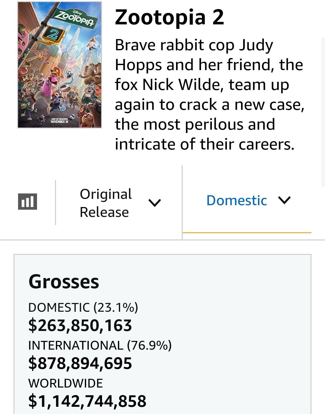 《疯狂动物城2》目前北美票房2.64亿美元,海外票房8.79亿美元,全球票房11.43亿美元,已超过《星际宝贝史迪奇》的全球10.38亿元票房,成为2025年好莱坞最卖座的电影。