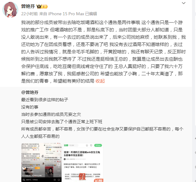 曾艳芳一边爆料陪酒乱象,一边称“相信创始人王总会保护成员”,被质疑弱化事件严重性。