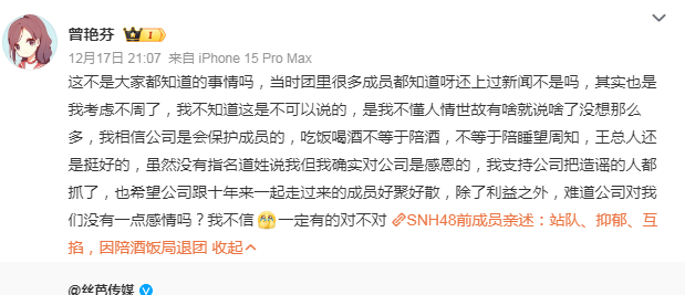 最近,丝芭传媒跟鞠婧祎解约闹翻,公司扬言要揭发鞠婧祎的经纪犯罪。此时,前成员曾艳芬揭发他们安排女艺人陪酒的争议,更是火上浇油。