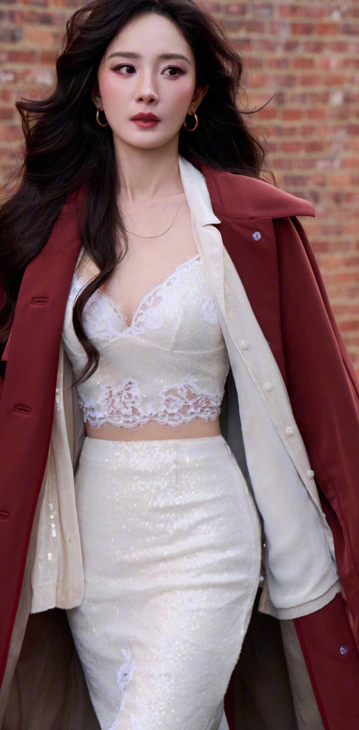 换上白色内衬胸衣的杨幂再披着深红色风衣,突然有了成熟的韵味,好多人都说杨幂是水蜜桃的身材,这样看来,杨幂的身材比水蜜桃还要好,