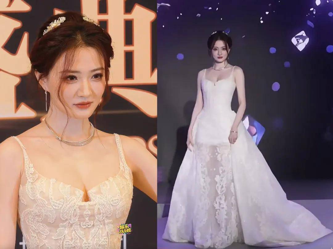 徐璐穿了一条白色纱裙,在内场上走秀时就像一位漂亮的新娘,当然也像一位颜值出众的婚纱模特。