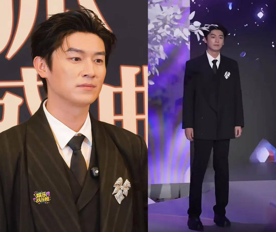 杨旭文穿了一套黑色条纹西装,要是给他换个背景,这一身还挺像银行或酒楼大堂经理的。