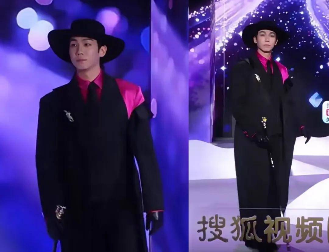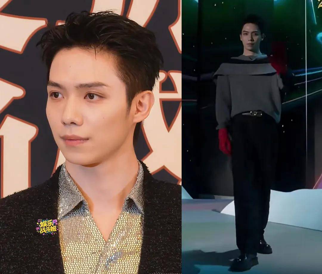 易烊千玺的好兄弟、中央戏剧学院2018级同学罗一舟,连换了两套造型亮相。一套是黑色、银色亮片西装,另一套是灰色上衣搭配红色手套,有点看不懂造型师想通过这两套造型表达什么。