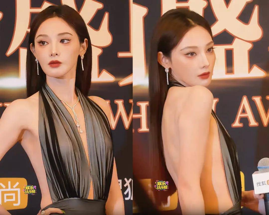 彭小苒穿了一条黑灰色挂脖纱裙,艳丽的妆容在她立体的五官上呈现出惊艳的效果,散发出一种很有攻击力的美。