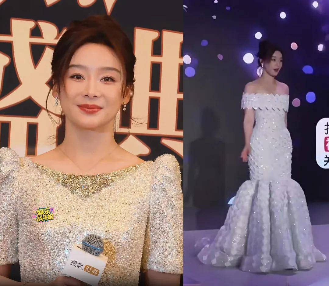 袁姗姗的妆发风格偏端庄大气,如果只看上半身的话有点央视主持人的既视感。到内场走秀时她换了一条银色一字肩鱼尾长裙,比起第一个造型会显年轻一些。