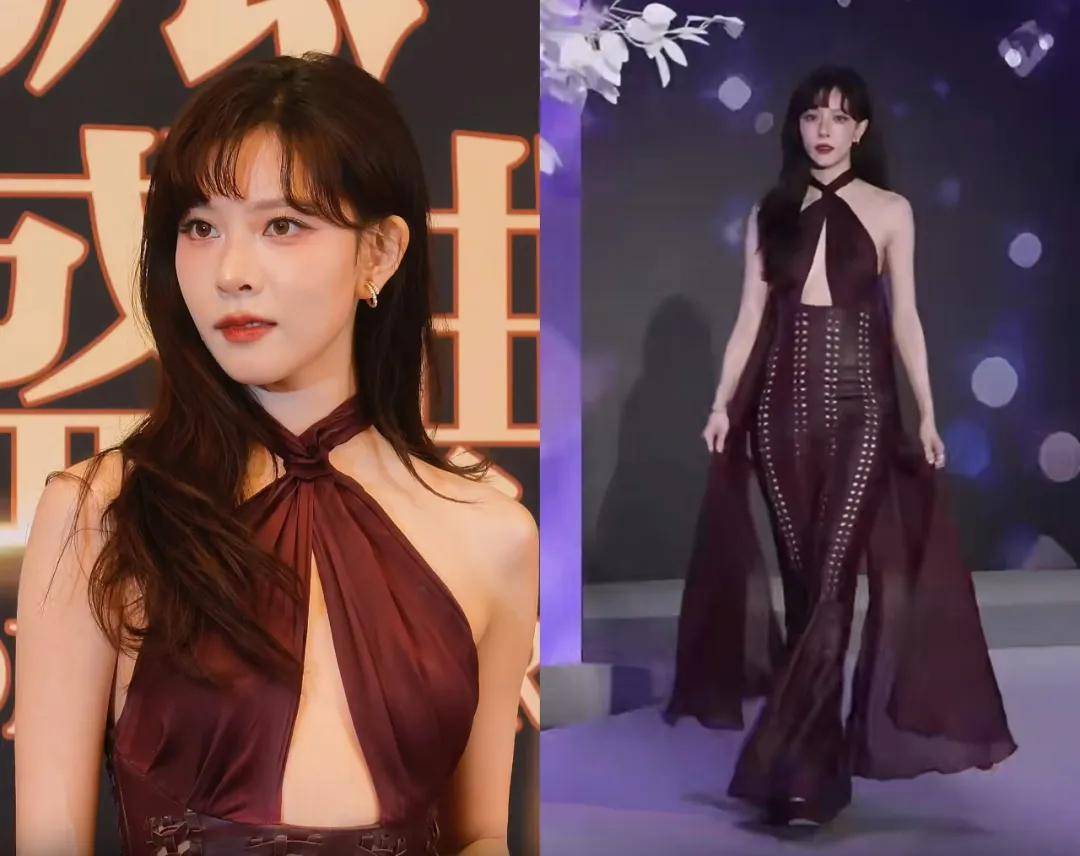 郁可唯也穿了亮晶晶的礼服,是一条黑金拼接亮片长裙。裙子的设计没有很好看,非要找优点的话应该是在闪光灯下足够闪亮吧。