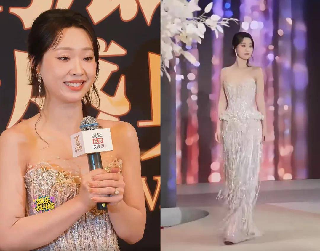 管乐穿了一条银色亮片流苏长裙,这种类型的礼裙跟身高修长的女明星都很搭,不过如果非要挑可以改进的地方,大概是发型,这盘发的碎发有点多了,某些角度看着略显凌乱。