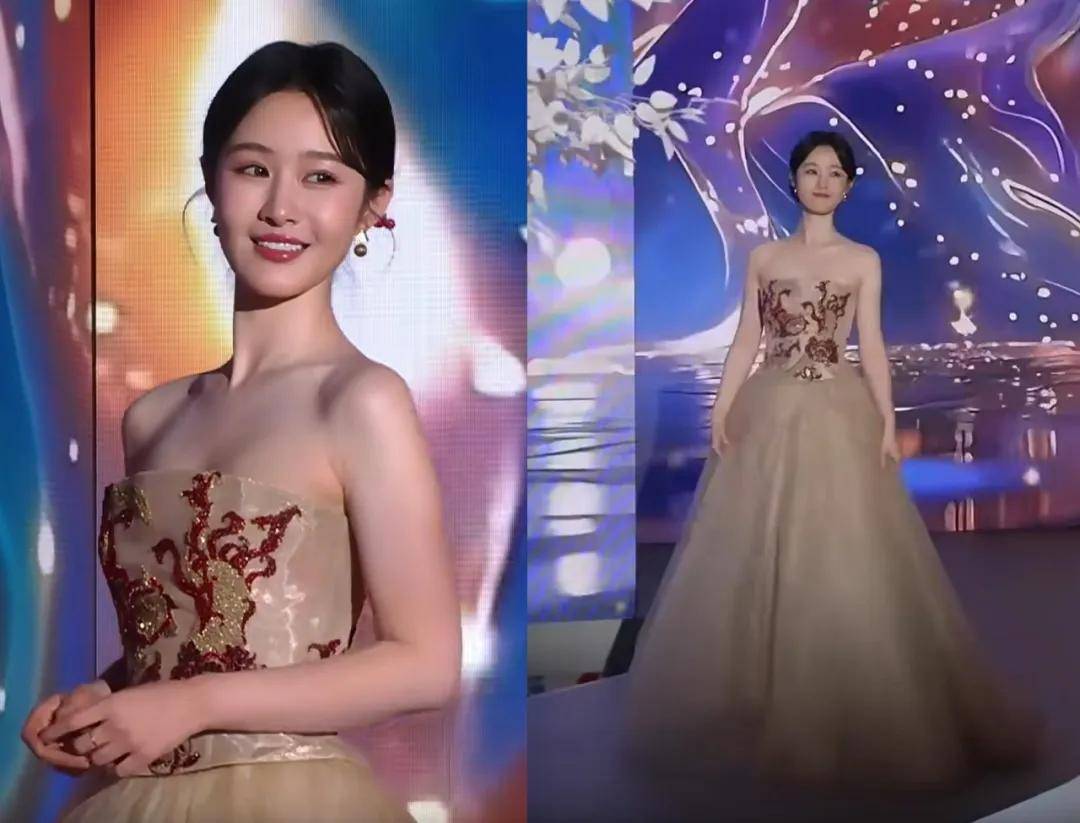 前芒果主持人梁田穿了一条平平无奇的浅棕色纱裙,但因为她本身长得好看,所以整体效果很好,知性大方。