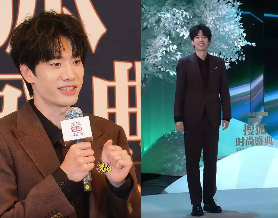 庞博的穿搭比较简单,是一套棕色西服,搭配清爽的发型和妆容,简简单单就挺顺眼的。