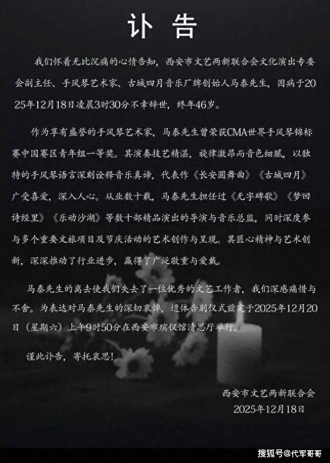 2025年12月19日,音乐圈传来悲痛噩耗,著名手风琴演奏家、古城四月音乐厂牌创始人马泰先生的讣告正式发布。讣告显示,马泰因病于12月18日凌晨3时30分不幸辞世,终年46岁,其遗体告别