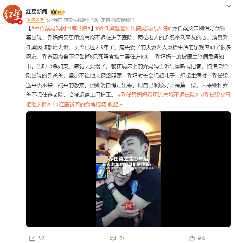 (来源:红星新闻)乔任梁父亲刚治好食物中毒出院,乔妈妈又患甲流高烧不退住进了医院。两位老人的近况牵动网友的心。演员乔任梁因抑郁症去世,至今已过去9年了。痛失爱子的夫妻两人