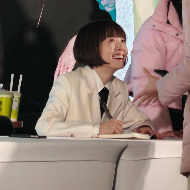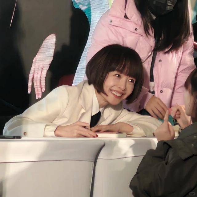 路人镜头下的她,一身白色职业装,标志性的短发,干练又知性,与大家说起话来,她总是笑盈盈的,眼睛里透着一种令人相信的光,真诚又专注。
