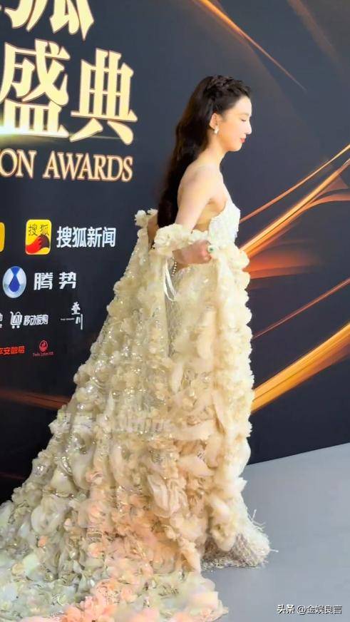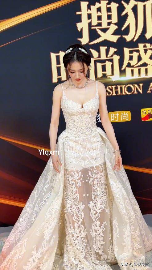 她选了一条香槟金吊带长裙,裙摆的重工设计低调显贵。
