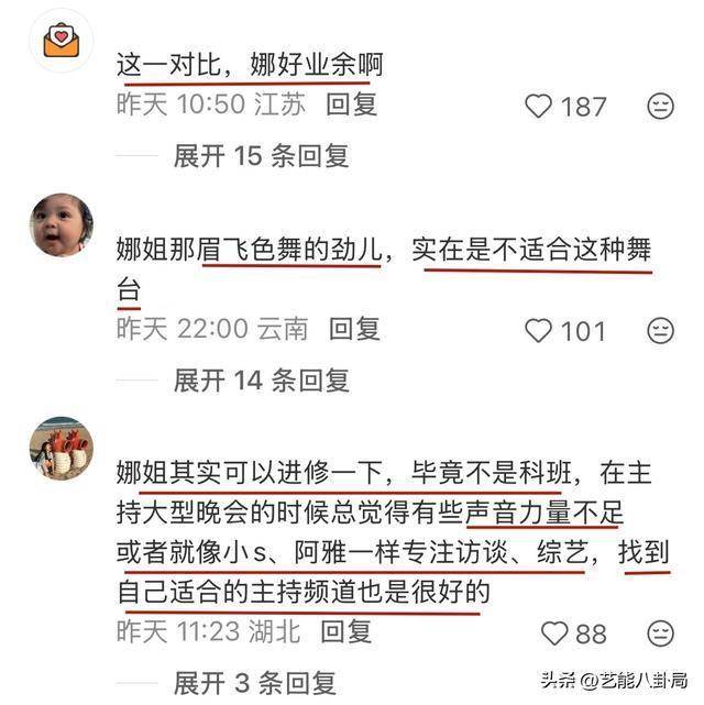 不看好的网友则觉得,综艺主持人的身份显然更适合她,强行向大型盛典主持跨越,看着还是有点吃力。